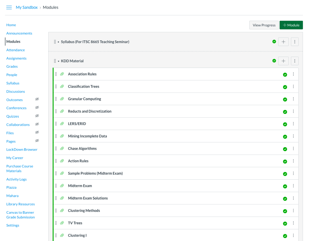 First, I have uploaded content from Dr. Ras’s Knowledge Discovery in Databases (KDD or ITCS 8162) course into my own “Canvas Sandbox” under the modules tab. In Canvas, modules are usually a way of organizing course content (such as by weeks) so that students can find what they need more easily. While I have only uploaded PowerPoint slides (as seen in the image below), it is also possible to add links to other types of content, such as videos or quizzes.