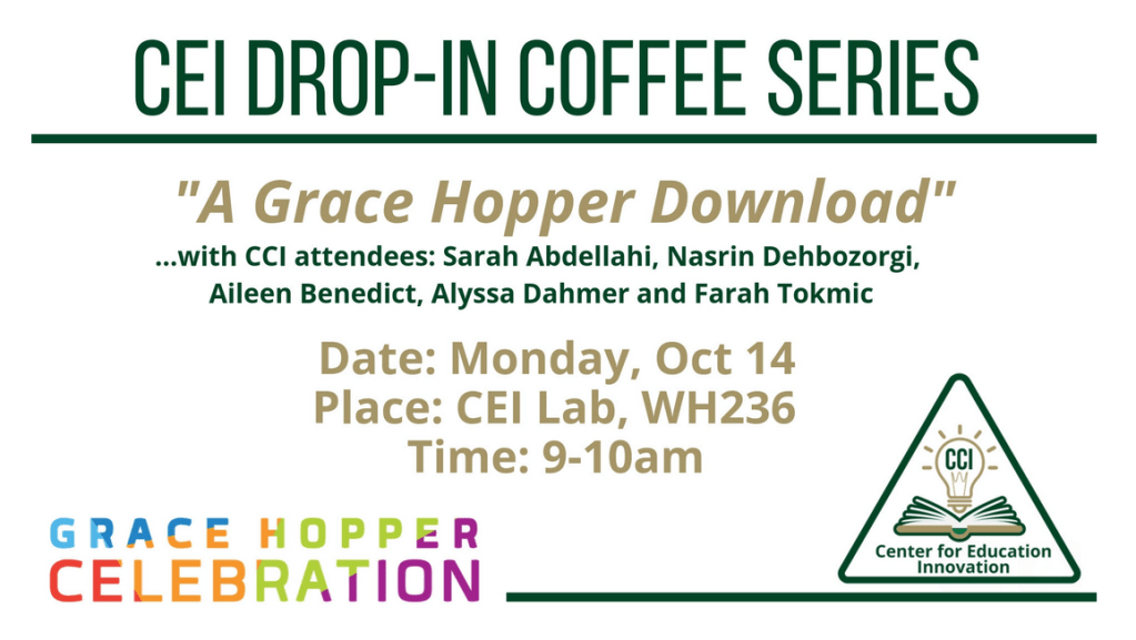 I also attended two of the CEI Drop-in Coffee Series. In the first one – “A Grace Hopper Download” – I helped discuss some of our experiences at the Grace Hopper Celebration in Orlando this semester. I really enjoyed the discussions had and hearing more about everyone else’s experiences here. In the second one – “The Missing Course” – we discussed the book “The Missing Course: Everything They Never Taught You About College Teaching” by David Gooblar.