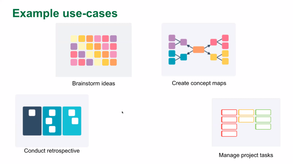 Next, Dr. Ramaprasad presented Miro Board. This is something we had actually used a lot in our teaching seminar course (ITSC 8665), so I was a little more familiar with this one before coming into the workshop. One difference that this online whiteboard had as compared to the previous one is that it can be used both synchronously and asynchronously. Students can open it up and make edits on their own time as well as during the class, while Whiteboard.fi must be used during the class, at the same time. Miro Board also provides many templates to start with, with a couple shown below: