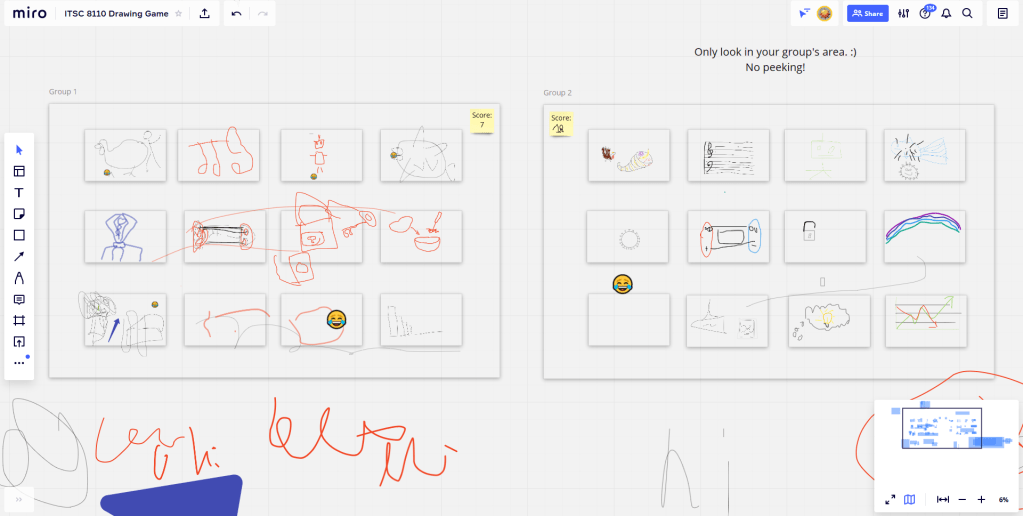 Along with the experience we got using Miro Board in our teaching seminar, I also got some experience presenting and facilitating an activity with this tool in my Intro to Research course (ITCS 8110). One of our assignments was to give a personal presentation – to present something about ourselves such as where we came from, hobbies, why we are here, etc. Since one of the overall goals of the class was to build community so that we could get to know each other more and keep in touch even after the class, I hoped use my personal presentation as a way for everyone to warm up and have a chance to talk to each other more. And so, with Dean Mili’s permission, I facilitated a game using Miro Board after briefly talking about my various interests (such as art) and how I’ve come to appreciate the value we can gain in our work by incorporating our many interests (e.g., designing prototypes can benefit from my interest with art).